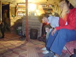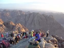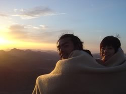 ダハブから車で2時間弱、モーゼが十戒を授かった山、シナイ山Sinai Mountainがあります。正式名ガバル・ムーサ。ここには夜中2時頃から登頂を始め、5時半のご来光目指して上るのですが、想像するよりかなり、かなりキツイ。自分で登る階段コースとラクダに途中まで連れて行ってもらうラクダ道コースがありますが、今思えばラクダに乗ればよかった…。ラクダは1人20LE程(¥400程)で乗れるそうです。真っ暗闇の中懐中電灯片手に満点の星を見上げながら登頂し、ご来光の美しさはご覧の通り。(寒さもご覧の通り)登頂途中で飲む山小屋でのシャーイも格別。 |