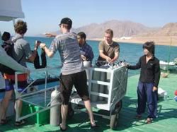 DahabでもScuba Diving!ダハブはビーチからのダイビングで有名なのですが、この日はボートダイビング。珊瑚の色彩や地形の面白さは紅海の中でもかなりレベルの高いポイントがいっぱい。 |