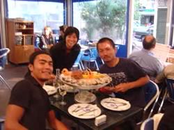 最後はやっぱり海の幸でマルセイユにお別れ。生の貝がこんなテンコ盛りなのにお安い!リヨンから一緒に行動している英二さんと。